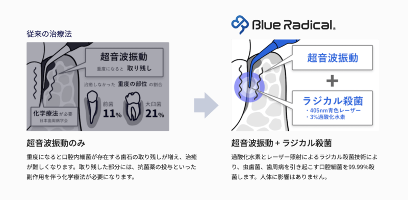 ブルーラジカルは、歯周病の原因となる細菌に直接働きかけることを目的とした治療法で、「切らずに歯周病菌を減らす」ことを特徴としています。
